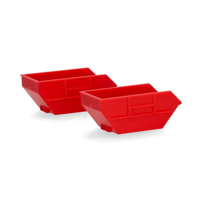 This set of two red 7m³ waste containers is ideal for decorating dioramas or as cargo for model trucks.