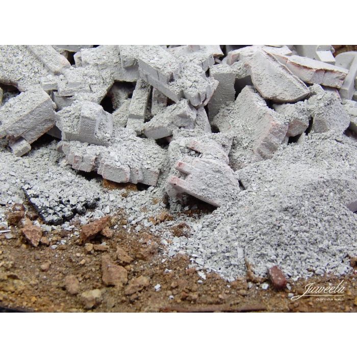 The colour of the dust matches exactly our rubble in brick red. Simply scattered on and between the rubble parts, the mountain of rubble appears even more realistic.