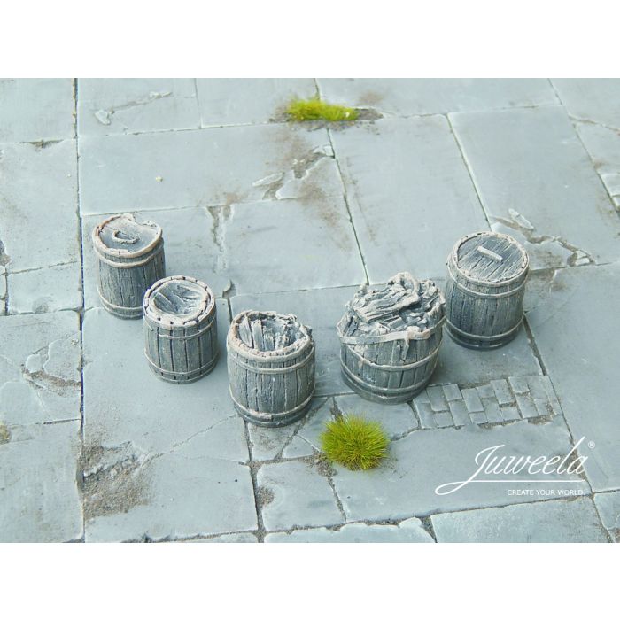 Old wooden barrels for the transport, as barrier, for stacking, as detail, as load, for dropping down or simply for the wine transport of your minis. These barrels here are old, worn, damaged, splintered