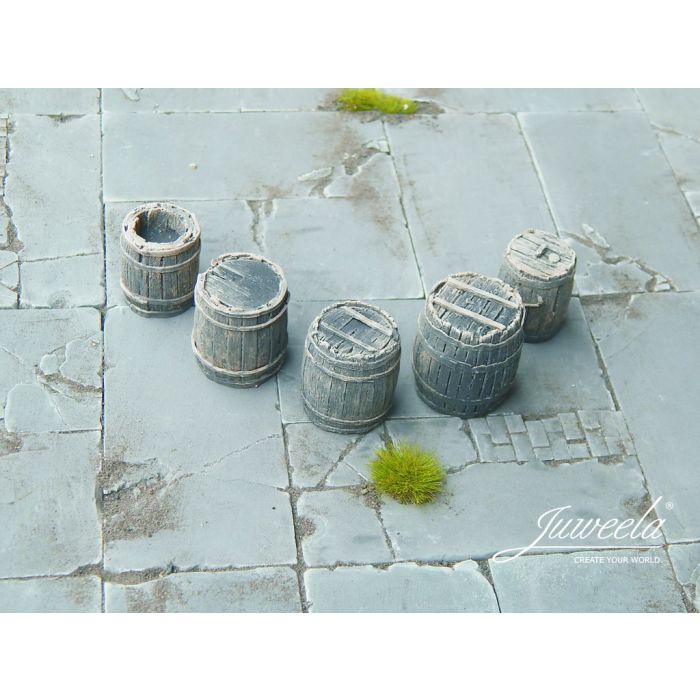 Old wooden barrels for the transport, as barrier, for stacking, as detail, as load, for dropping down or simply for the wine transport of your minis. These barrels here are old, worn, damaged, splintered