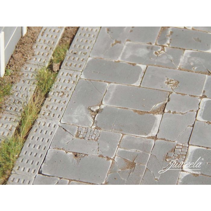 Concrete slabs that fit perfectly into any diorama. These slabs show clear signs of use: cracks, broken or chipped edges, scuff marks, wear, repairs, and holes where grass can grow.